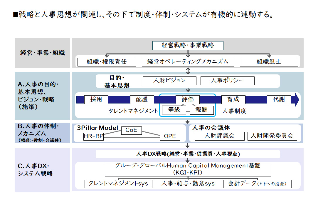 人事を戦略的に実行するためには、まず経営・事業戦略がしっかりと存在し、その戦略と人事思想が密接に関連していることが重要です。この関係性が確立されることで、人事の各施策が効果的に機能します。特に、3ピラーモデルのような体制が整備され、その体制が円滑に機能するためのシステムが存在することが求められます。