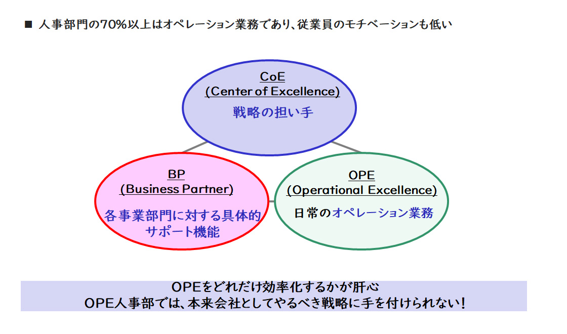 単に3ピラーモデルのような体制を構築しても、機能させるのは容易ではありません。戦略から人事のミッションを定義し、CoE(センター・オブ・エクセレンス)、BP(ビジネスパートナー)、OPE(オペレーション)の職務を明確にすることが重要です。