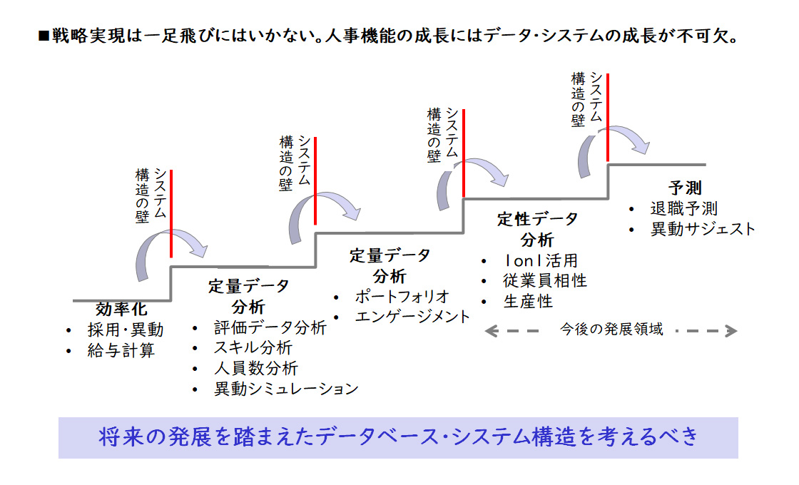 人事戦略をシステム面で高度化する過程は、まず効率化から始まります。具体的には、評価データや人員数の分析、ポートフォリオの活用からスタートし、ゆくゆくは1on1の活用や従業員の相性分析など、より発展的な領域に進んでいくことが期待されます。最終的には、これらのデータを基に予測を行うことが目標となるでしょう。