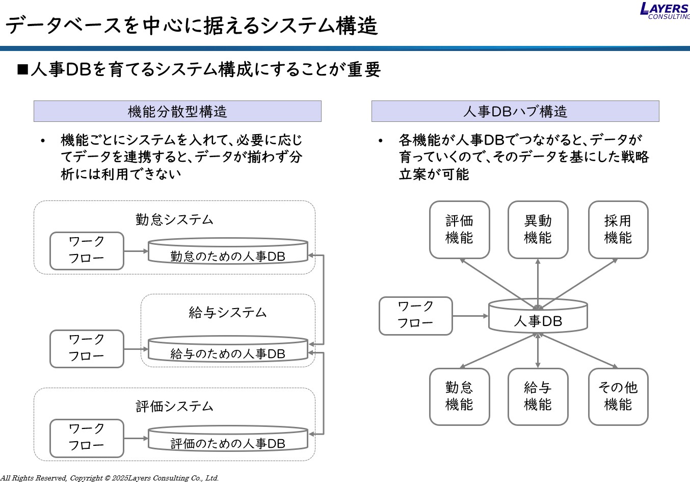 そこで当社が提唱したいのは、人事のデータベースを中心に据え、各システム機能がそのデータを使用するという関係です。つまり、人事データベースハブ構造が戦略立案上非常に優れていると考えます。このような構造にするためには、人事データベースを外付けで持つか、実装の難易度や速さを考慮して統合型のパッケージを持つことが優位であると考えられます。