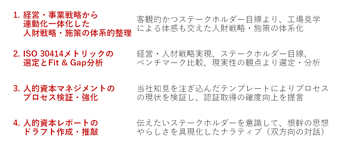 第3の当社切り口・取り組みは、“人的資本マネジメントのプロセス検証・強化”です。ISO30414のメトリックは本来、人的資本マネジメントに活用してこそ企業価値向上に資するものです。それには、例えば各メトリックについて、その構成要素であるデータの取得元や安全性・信頼性、メトリック自体の報告先等を、マネジメントの仕組みとして確立する必要があります。当社は、ISO30414のプロフェッショナル認証を受けたコンサルタントが有する知見と、多くのプロジェクトの知見を注ぎ込んだ検証用テンプレートを活用して、迅速かつ網羅的に人的資本マネジメントのプロセスを検証しました。そして、その検証結果に基づいてISO30414に対する準拠度合いを確認し、その引き上げに向けたディスカッションとプロセス改善の提言を通じて、認証取得の確度を高めて来ました。