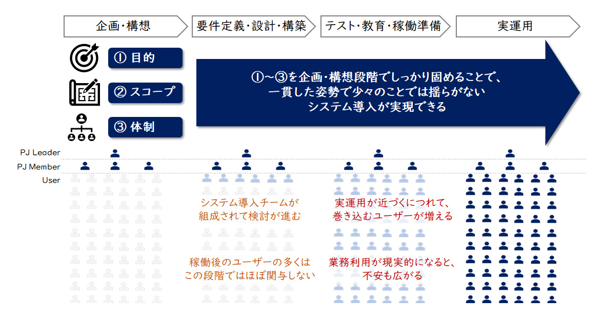 システム企画・構想段階のポイントは、ずばり「①目的・②スコープ・③体制」の3点です。