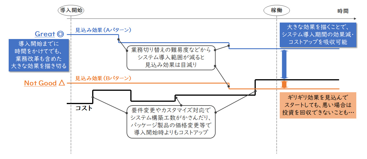 保守切れが近いことを理由に立ち上げたプロジェクトで、現状業務を変えることなくその効率化を目標に掲げ、ギリギリ投資額を回収できる見込みというところで導入・構築段階に進むとどうなるでしょうか。「システム要件定義を進めるうちに、今の業務に合わせるためのカスタマイズが多いことが分かり、開発費が想定より膨らみ…」や、「為替の影響を受けて来年以後のアカウント利用料は2割値上げされることが分かり…」などが想定されます。