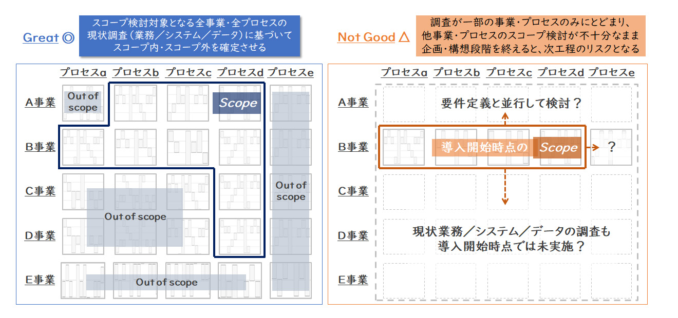 一部の業務の流れやデータの流れを整理することをせずに、スコープとするかどうかの判断を導入・構築段階に数多く先送りするとどうなるでしょうか。非常に困ったことに、企画・構想段階でうっかり自分に都合のよい絵を描いていたことが後々判明することが多く見受けられます。「その業務が残るのであれば、廃止できると想定していたシステムを残さざるを得なくなり…」と誰かが話す一方で、「その業務をスコープとすると、当初想定していなかったカスタマイズやシステムインターフェースが発生して…」と誰かが話すとします。いずれも企画・構想段階で思い描いた導入効果が目減りすることとなります。