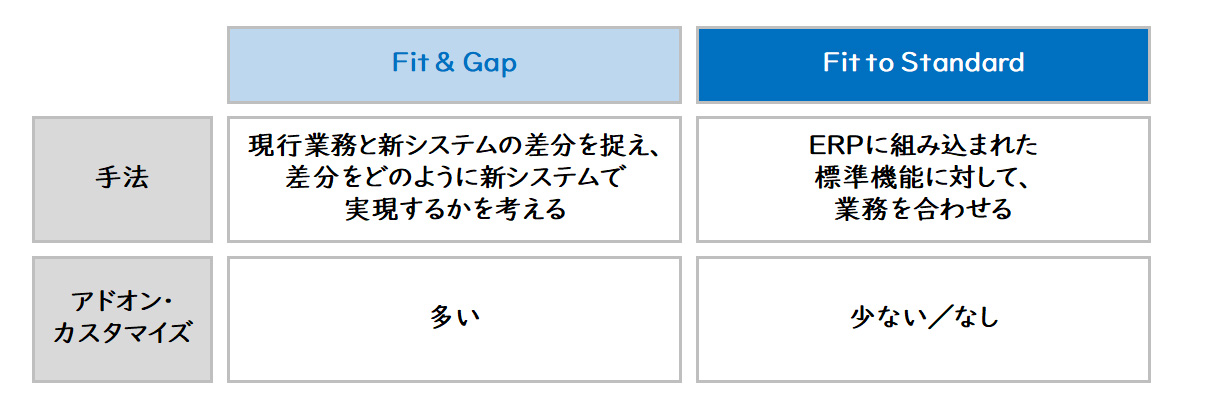 Fit & Gapは、現行業務と新システムの差分を捉え、差分をどのように新システムで実現するかを考える手法です。現行業務の実行を担保できる一方、結果的に現行業務に新システムを合わせるため、不足機能を追加開発で補うことになりがちです。自社業務に最適化されたシステムとの前提を置いた場合、Fit & Gapの手法が取られることが一般的でしたが、これがアドオンやカスタマイズを増やす大きな原因になっています。一方、Fit to Standardは、ERPに組み込まれた標準機能に対して、業務を合わせる手法です。Fit to Standardでは、どのように業務を標準機能に合わせるかがポイントです。