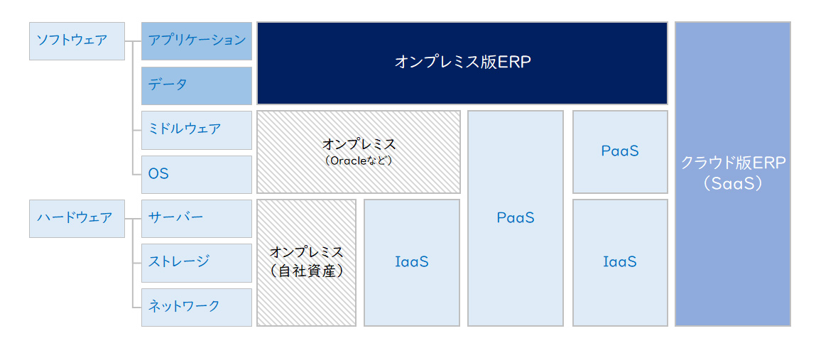 これらのシステム資源を全て自社の施設内(オンプレミス)に設置されたハードウェア上で運用・管理する形態で持つことをオンプレミスといいます。これらのシステム資源をクラウドサービスとしてすべて提供を受けることをSaaS(Software as a Service:特定のアプリケーションやソフトウェアをクラウド上で提供するサービス)といいます。