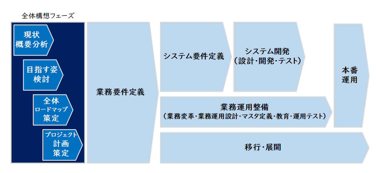 - 全体構想策定フェーズは、主管部門であるユーザー部門の中長期的な目指す姿、一定のゴールで実現したい要件と時間軸などを描きます。