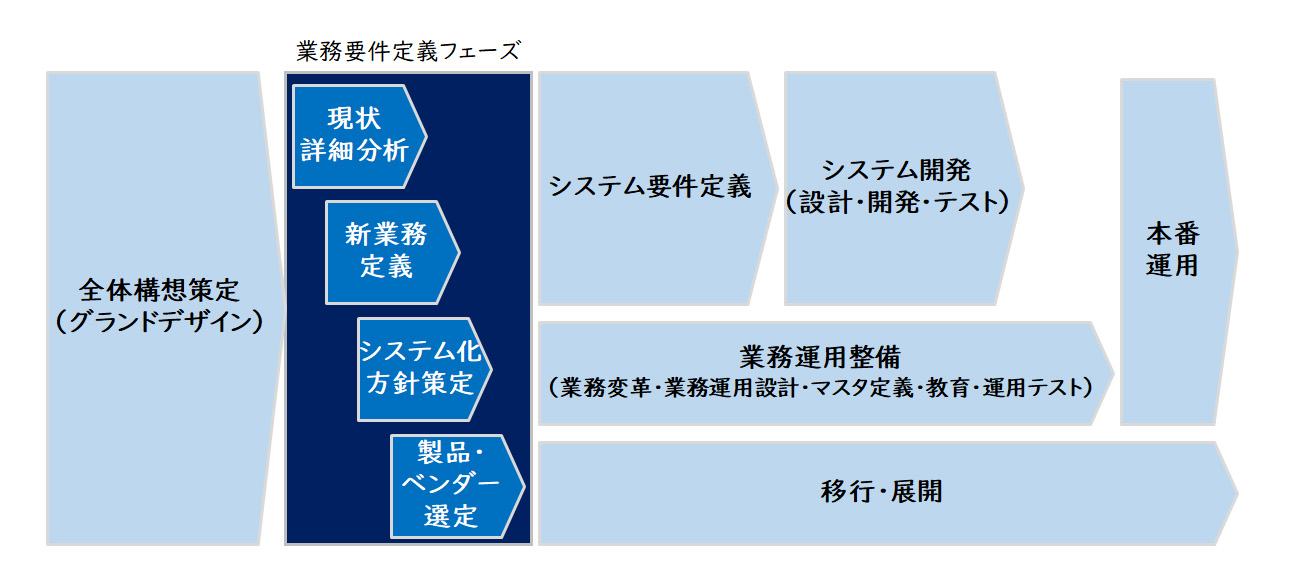 業務要件定義フェーズは、今後目指す新しい業務を具体化し、それを実現するためのシステム化方針を明確化するとともに、導入対象となるERPと導入ベンダーを選定するフェーズです。