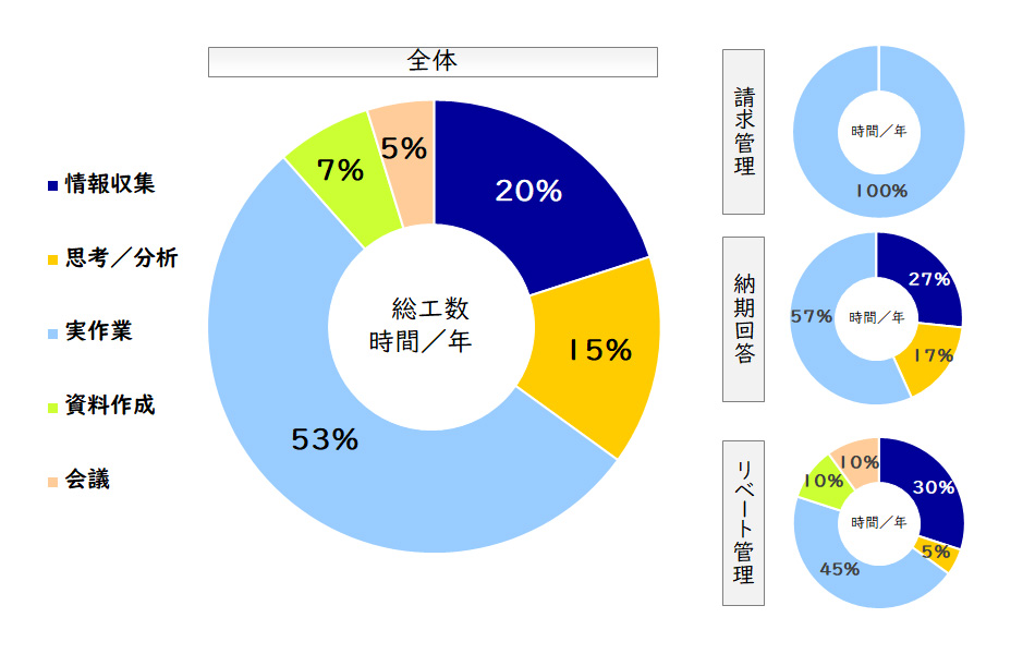 また、業務量分析においては、各業務を「思考分析、情報収集、実作業、資料作成、会議」といった作業に分けて調査します。作業別の工数割合を出すことによって、外からあまり見えないその業務の内容や質が推察できるからです。業務量分析おいて、全体として工数が多く、思考分析が少ない業務は、一般的に効率化余地が高いため、これらの業務から優先して業務課題を検討していきます。