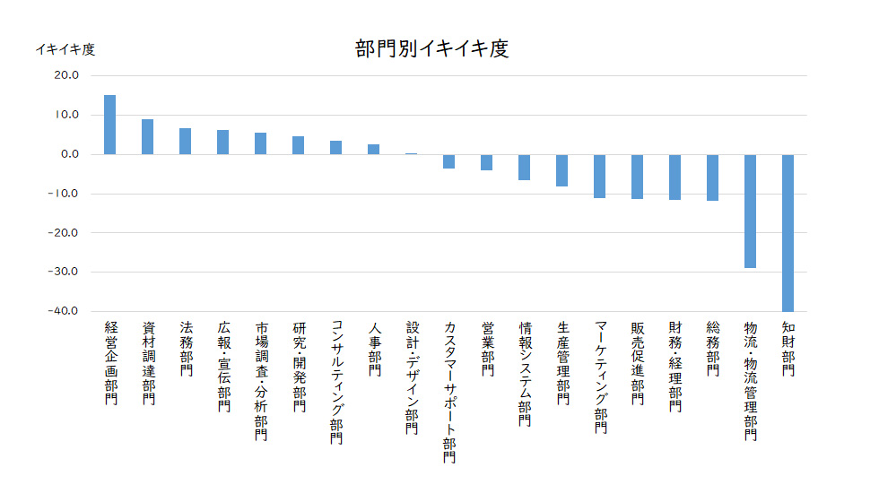 イキイキ度と業務の生産性とは相関関係が強く、イキイキ度が低い部門は生産性の低い業務を多く抱えていいます。例えば、品質保証部門で顧客からのクレーム対応などを行っている場合、これらが後ろ向きな仕事と捉えられイキイキ度が低くなりますし、販売部門で請求書発行、入金チェック、消込作業などの単純業務が多いとイキイキ度が低くなります。特に、部門全体としてイキイキ度が低い場合(一般平均水準を大きく下回る場合)、部門全体のイキイキ度を上げるためには、今後どのような組織や業務へ変えていくべきかといった検討が必要になります。