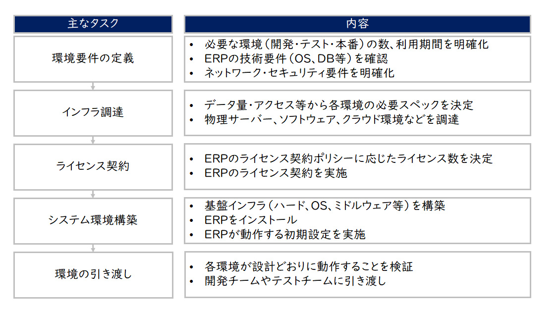 システム環境構築では、主に選定したERPについて、システム要件定義としての実機検証ができるようにシステム環境を構築します。また、システム開発フェーズにおける開発環境、テスト環境、本番環境などの構築準備を行います。これらの環境は、ERP環境、アドオン環境、インターフェース環境ごとに用意する場合があるので、情報システム部門や導入ベンダーと連携して進めます。