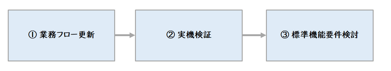 標準機能検証では、選定したERPに合わせて業務フローを更新する①業務フロー更新、業務フローについて実機を使い検証する②実機検証、実機検証の結果として標準機能の要件を固める③標準機能要件定義があります。