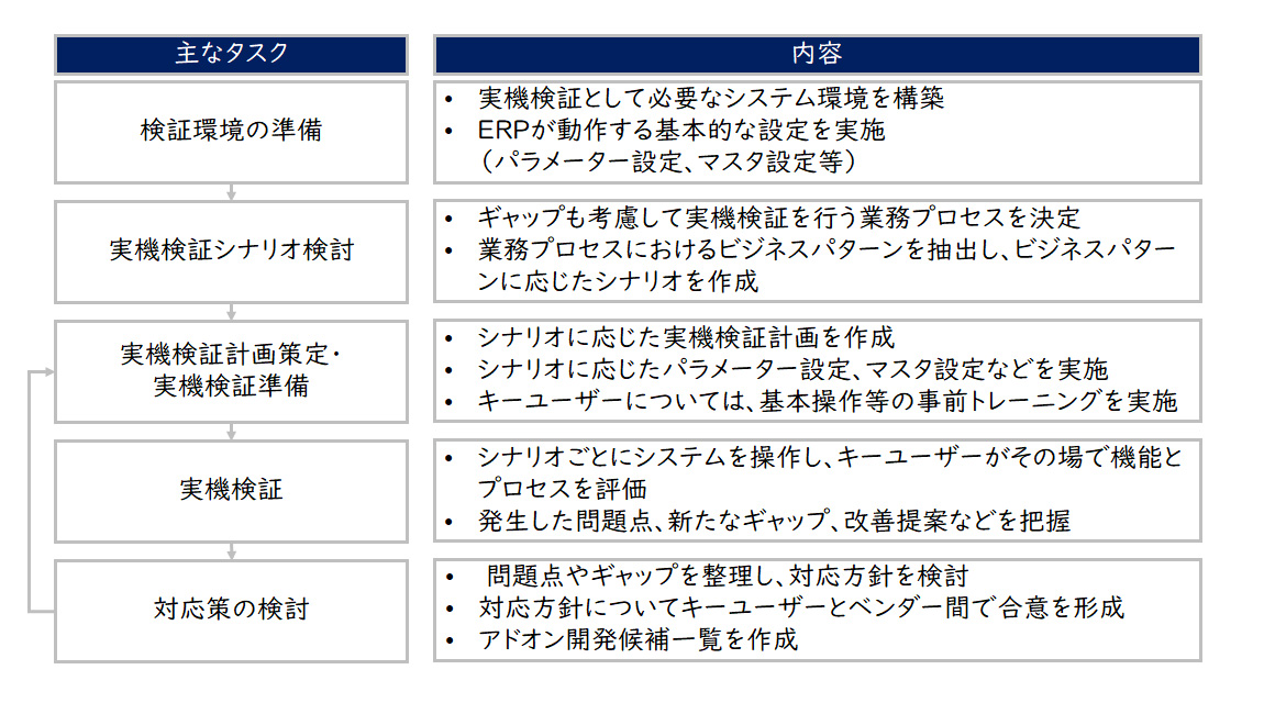 - 標準機能検証②③の要点:業務シナリオをエンド・トゥ・エンドで検証し、ギャップ対応策(設定変更・代替業務フロー・アドオン案)を整理し、主要マスタ(組織・品目・勘定科目)や、パラメーター値を確定して標準機能要件定義を最終化。