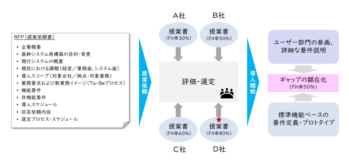 こう見ると結局RFPを作成するように見えますが、従来のRFPが製品・ベンダーの選定を目的としているのに対し、ここでのRFPは導入に対する提案と見積の依頼がメインとなります。また、Fit to Standard検証により適合性が評価された状態での見積となるため、導入後の見積のブレのリスクを低減することができます。Fit to Standard検証は、システム要件定義以降も引き続き実施していくことで、ユーザー部門主導でERPの標準機能を使い倒すことが期待できます。