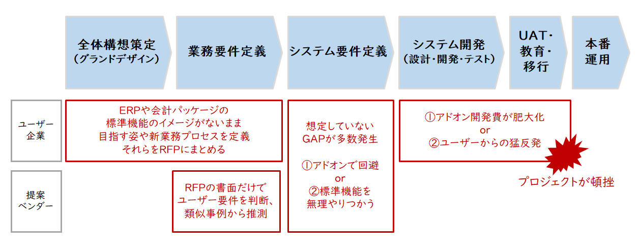 システム要件定義の段階でシステムの主管部門であるユーザー部門も交えて、ERPの持つ標準機能や標準プロセスを評価します。しかしこの段階で、RFP作成時やベンダー選定時には想定していなかったギャップが多く発見され、最悪の場合にはプロジェクトが頓挫するケースも少なくありません。つまり、一生懸命RFPを作っても、ERPやベンダーの見極めが正しくできるとは限らないということです。