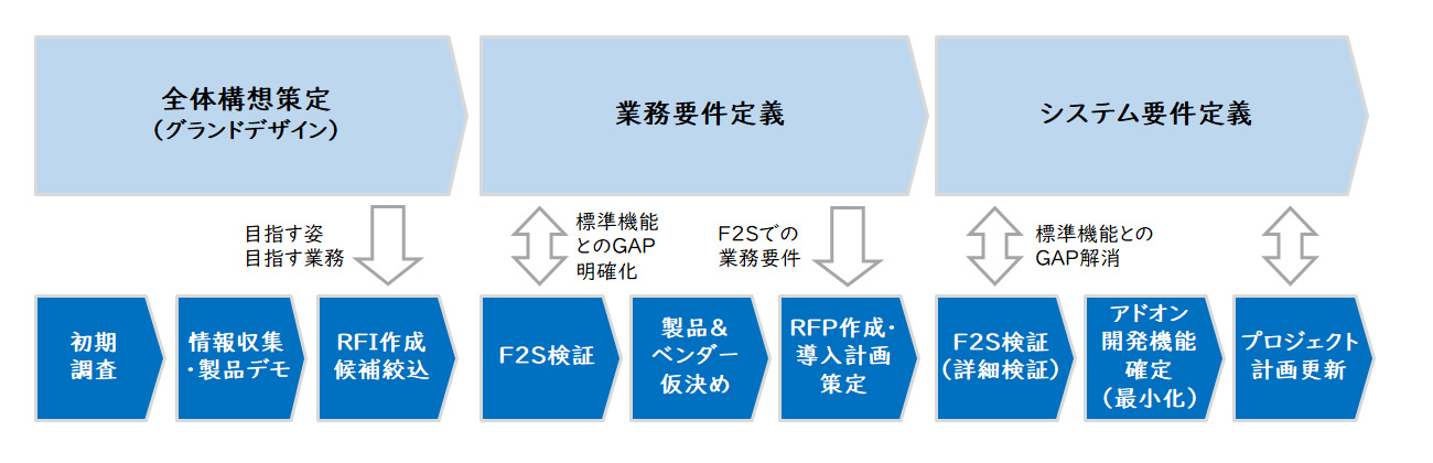 例えば、全体構想策定段階からERP候補を調査し、事前に標準機能とGAPになりそうな業務について、Fit to Standardで導入できるかを検証する方法があります。