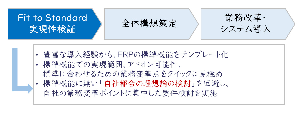 Fit to Standard実現性検証フェーズでは、ERPの標準機能を想定しながら、自社で大きく違うところはどこか、その違いをどう解決していくのか、解決するための利害関係者への対応はどうするかといった方向性を見極めます。また、Fit to Standard実現性検証により、ユーザー部門がERPの標準機能を事前に理解するため、全体構想策定フェーズにおいて「標準機能に無い自社都合の理想論の検討」にならず、自社の業務改革ポイントに集中した検討が可能になります。