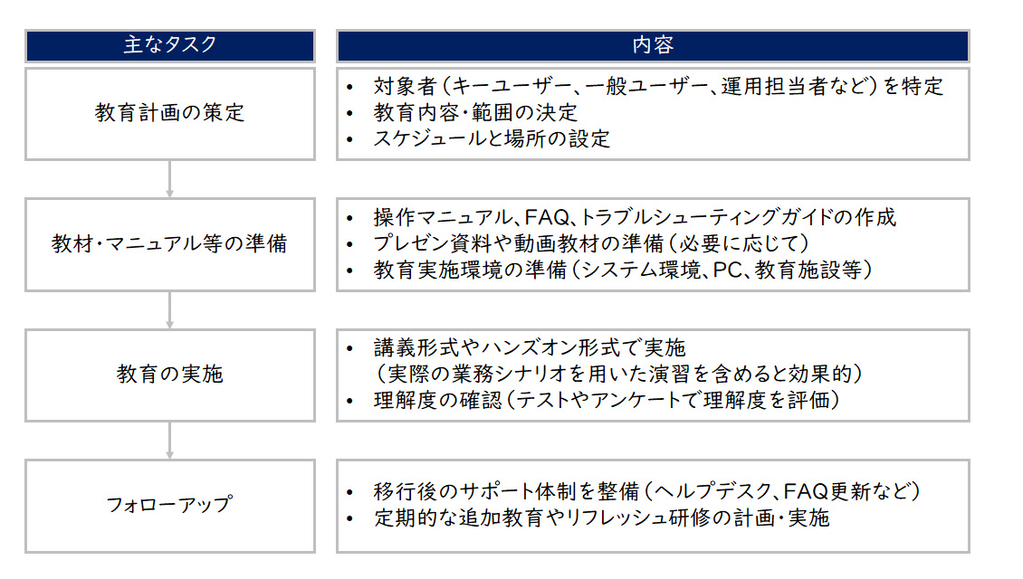 教育の実施タイミングも重要です。教育が本番移行の直前となると思わぬトラブル等により、スケジュールが変更されることもあります。ユーザー部門の業務負荷等を考慮したうえで、余裕を持って適切なタイミングで実施することが重要です。